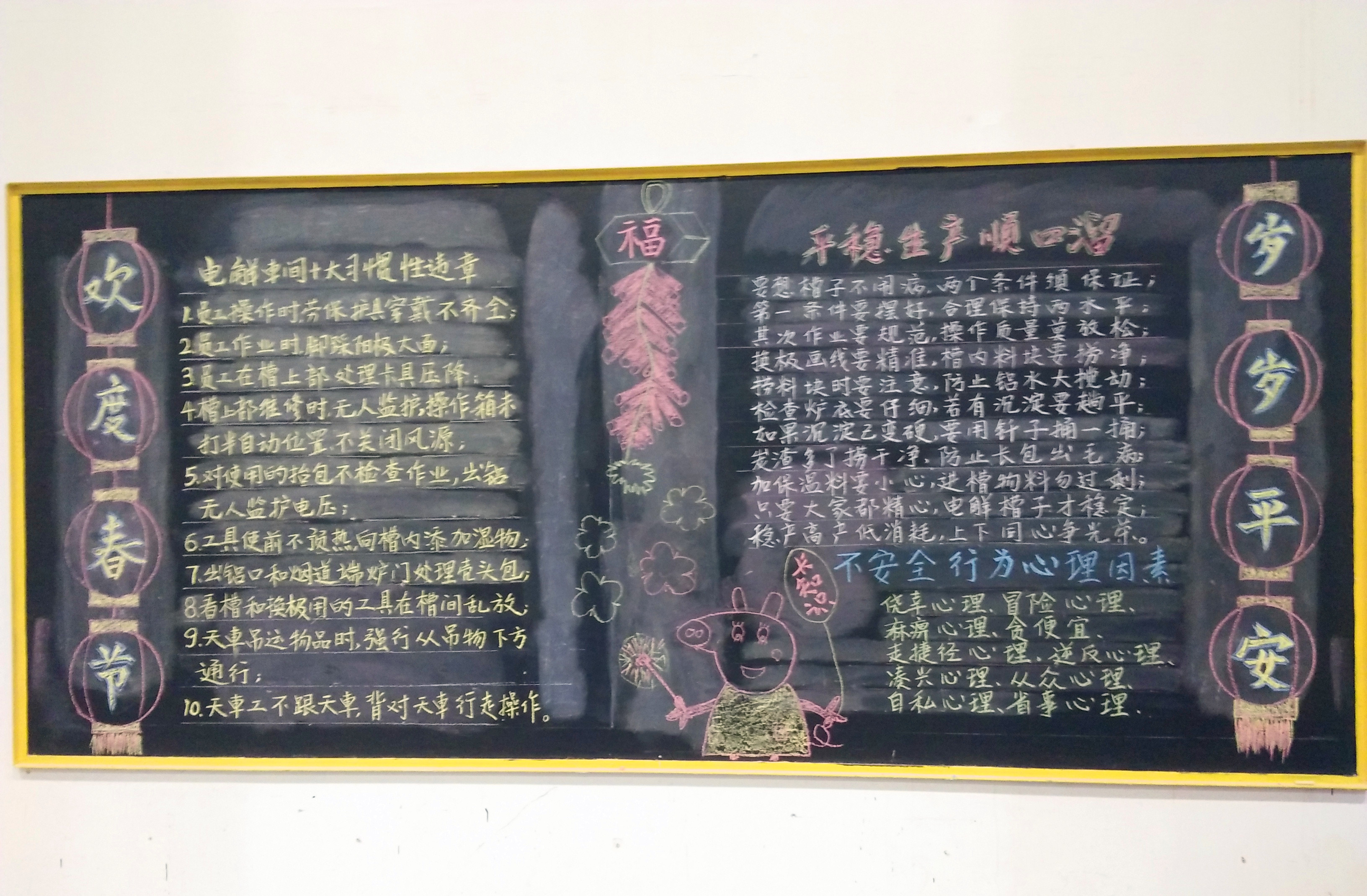 年末歲首,板報(bào)宣傳員派來亥豬大使——小豬佩奇,及時(shí)給職工送來新年的祝福!靶∝i佩奇!小豬佩奇……”“哈哈哈……”,交接班前后,藝術(shù)化的亥豬形象吸引著職工紛紛駐足閱覽,引得大伙囅然而笑。小小的童趣,像新生兒的啼哭一樣,撩撥著各位職工的安全責(zé)任感、工作使命感。 “信仰認(rèn)定了就要信上一輩子”。電解一車間宣傳員積極響應(yīng)黨組織部署,及時(shí)推出了“學(xué)習(xí)強(qiáng)國”專欄,及時(shí)呈送領(lǐng)袖金句,宣傳黨的治國理政理念。 在做“新”思想宣傳工作的同時(shí),“活”也是一車間黑板報(bào)吸收人的地方!耙氩圩硬霍[病,兩個(gè)條件須保證;第一條件要擺好,合理保持兩水平……”《平穩(wěn)生產(chǎn)順口溜》以通俗易懂、朗朗上口的語言形式,向職工宣貫生產(chǎn)技術(shù)及作業(yè)操作要領(lǐng)。 緊扣車間生產(chǎn)管理工作重心——安全生產(chǎn),做“實(shí)”宣傳、緊接“地氣”,更是電解一車間黑板報(bào)技高一籌的地方!峨娊廛囬g十大習(xí)慣性違章》、《電解生產(chǎn)風(fēng)險(xiǎn)源辨識(shí)與預(yù)防措施》,簡明扼要、提綱挈領(lǐng)地總結(jié)概括了生產(chǎn)作業(yè)要點(diǎn);《不安全行為心理因素》更是切中要害,一語中的地批判、糾正著工作中的形形色色的違章冒險(xiǎn)行為。 “簡約”而不“簡單”:鮮明的宣傳主題,藝術(shù)而生動(dòng)的配圖,貼近職工生產(chǎn)實(shí)際需要的內(nèi)容,簡潔明快的語言風(fēng)格,勾動(dòng)著職工閱覽享受的欲望。對(duì)照板報(bào)內(nèi)容,一場場批評(píng)與自我批評(píng)在職工生產(chǎn)生活中悄然拉開戰(zhàn)幕。過程,總是唇槍舌劍;結(jié)局,定是捧腹大笑。在炙熱枯燥的電解生產(chǎn)環(huán)境里,黑板報(bào)成為了一道調(diào)味劑。在職工們的相互戲謔中,小小黑板報(bào)潛移默化地發(fā)揮著撥亂反正的巨大作用。 黑板報(bào)的成功,源于職工智慧的結(jié)晶。車間主任舒增社親自主陣謀劃、調(diào)兵遣將,年輕有為的副主任任雷構(gòu)思謀篇、布局編輯,初出茅廬的電解專工李亦非搜集題材、宣傳創(chuàng)意。李寶軍、秦峰一改往日電解工淳樸憨厚形象,蒼勁有力的硬筆書法博得眾人連連嘆服。 “沉舟側(cè)畔千帆過,病樹前頭萬木春”。鋁鎂合金電解一車間的小小黑板報(bào),在僅限的幾個(gè)平方米的空間內(nèi),以“新”、“活”、“實(shí)”的獨(dú)特宣傳形式,積攢起美鑫人創(chuàng)業(yè)干事的正能量,續(xù)寫著“老壺”換“新酒”的故事……
